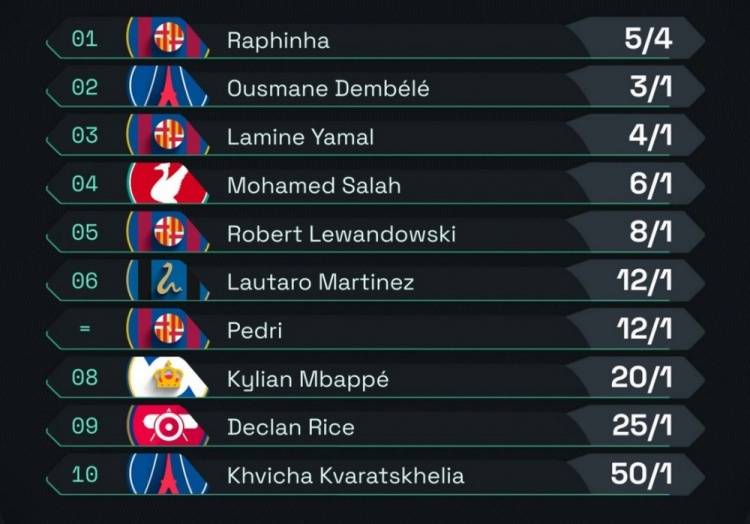 就在刚刚,国外媒体Squawka公布了最新一期的2025金球奖赔率排名。截止到目前,排在第1位的是巴萨前锋拉菲尼亚,他当前的赔率为5/4。客观来说,现如今这位巴西前锋距离夺得生涯第1座金球奖已经非常接近了。出色的个人数据外加巴萨良好的赛季前景,这些都是球员争夺金球奖的助力。接下来只要能够维持住这个势头,那么拉菲尼亚拿下金球奖是大概率的。