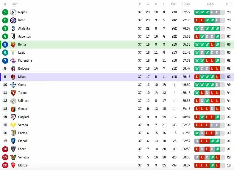 当意甲第37轮的9场比赛在北京时间5月19日凌晨同时拉开帷幕时,梅阿查球场的灯光与塔尔迪尼球场的晚风,早已为一场注定载入史册的争冠大戏埋下伏笔。积分榜上,那不勒斯以1分优势领跑,国米如影随形,两队身后的AC米兰虎视眈眈,让这场双雄对决从第一分钟起便笼罩着窒息般的紧张感。